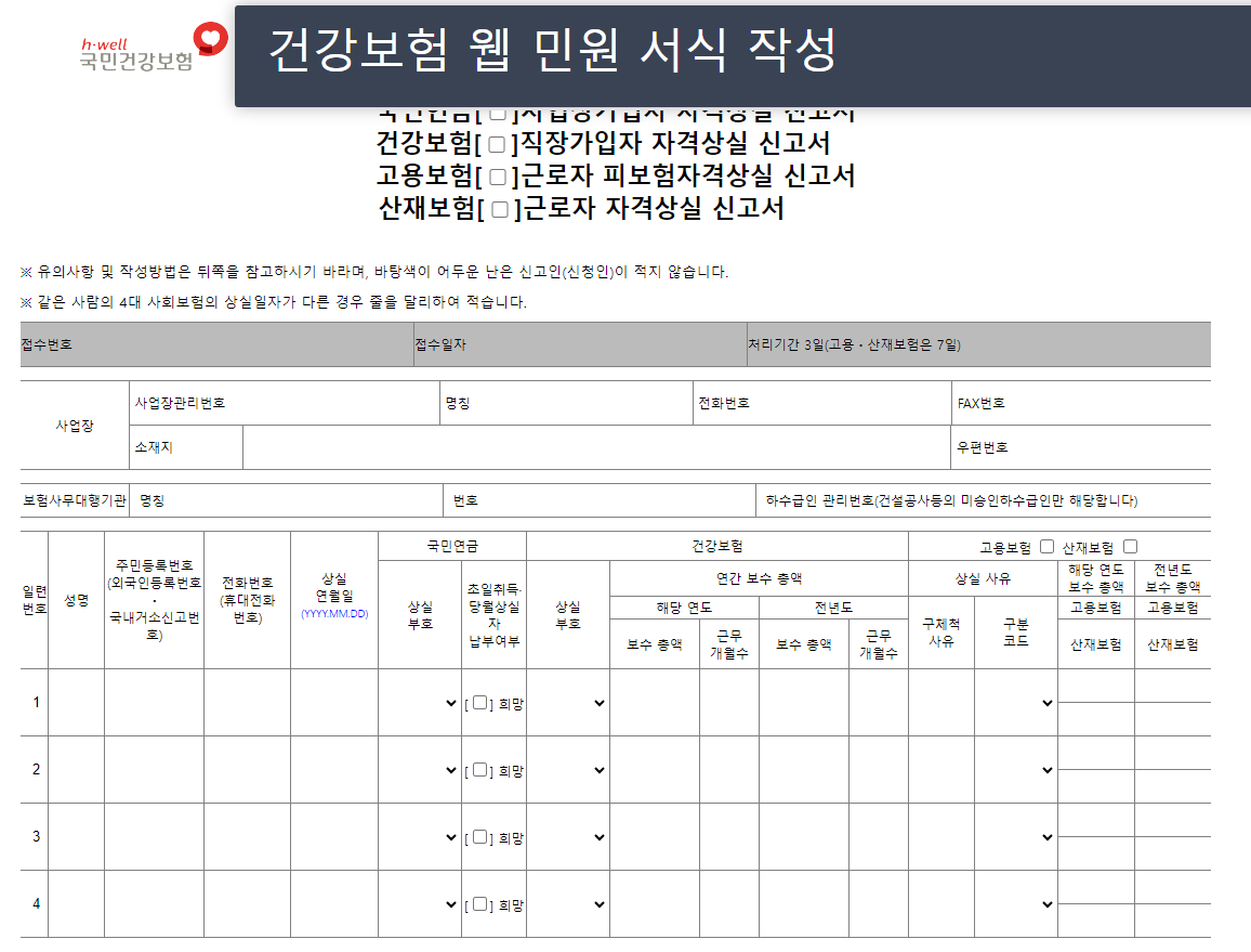 먼저, 필요한 신고서 양식을 각 공단의 공식 웹사이트에서 다운로드합니다. 이 양식은 4대 보험에 공통적으로 사용되며, 근로자의 인적사항, 상실일, 상실사유 등을 기재하는 데 사용됩니다.