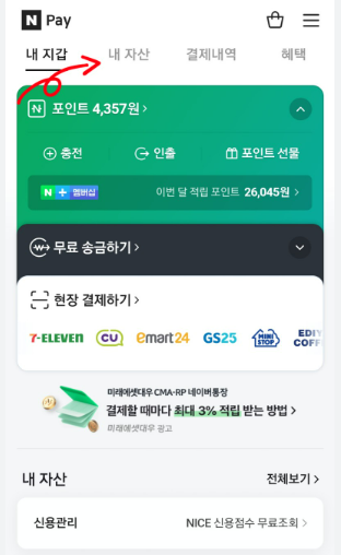 - Pay 아이콘 선택: 네이버 앱 상단에 위치한 Pay 아이콘을 클릭합니다.