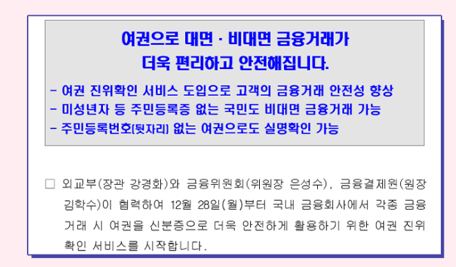 - 여행 및 거래의 안전성 보장: 여권은 국제 여행 및 거래에서 신뢰할 수 있는 신분증명 수단입니다. 여권의 진위를 확인함으로써, 여행자 및 거래 당사자들은 상대방의 신분에 대한 확신을 가질 수 있고, 이는 전반적인 안전성과 신뢰성을 높입니다.