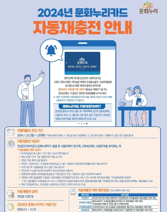 2023년에 문화 누리카드를 발급받았고 수급자격을 유지하고 있는 경우, 별도의 신청 절차 없이 자동으로 2024년 지원금이 카드에 충전됩니다. 자동재충전이 완료되면 1월 말에 문자로 안내가 됩니다.