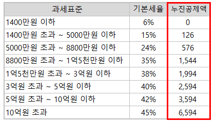 - 공제액은 과세표준과 적용 세율에 따라 달라집니다. 예를 들어, 과세표준이 4,600만 원을 초과하고 8,800만 원 이하인 경우 522만 원의 누진공제가 적용됩니다.