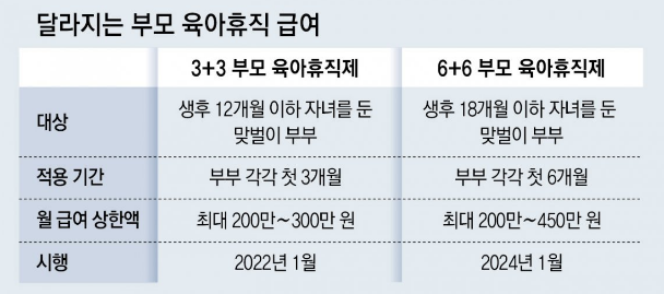 2024년 1월 1일부터는 부부 육아휴직 제도가 '6+6'으로 확대됩니다. 이는 부모가 각각 6개월씩, 총 12개월 부부 육아휴직으로 사용할 수 있음을 의미합니다. 통상임금의 100%를 기준으로, 첫 6개월 동안은 매월 금액이 상한액 첫 달 200만 원부터 시작해 매달 50만 원씩 증가하여, 6개월째에는 최대 450만 원까지 지급됩니다.