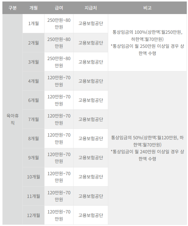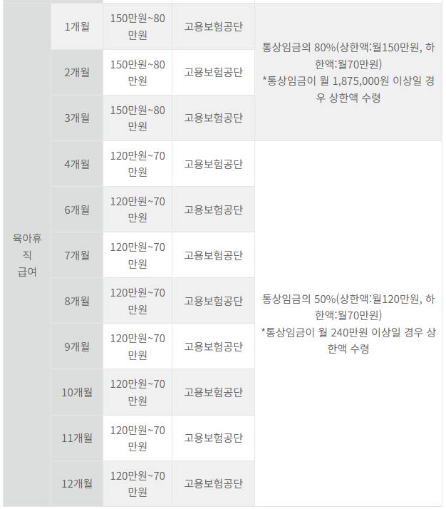 - 급여 금액: 육아휴직 기간(최대 1년) 동안 통상임금의 80%를 지급하며, 상한액은 월 150만 원, 하한액은 월 70만 원입니다.