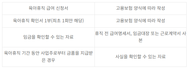 - 육아휴직 확인서, 통상임금 확인 증명서류(월급명세서나 근로계약서), 임신 중 상태 증명서류(있는 경우)가 필요합니다.