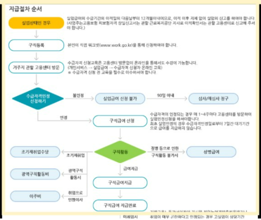 - 수급자격 신청: 거주지 관할 고용센터를 방문하여 수급자격 신청 교육을 받은 후 실업급여 수급자격을 신청합니다. 온라인으로도 신청 가능합니다.