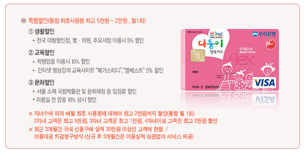 - 신용카드 할인: 대중교통, 대형 할인점, 병원, 서점 등에서 할인